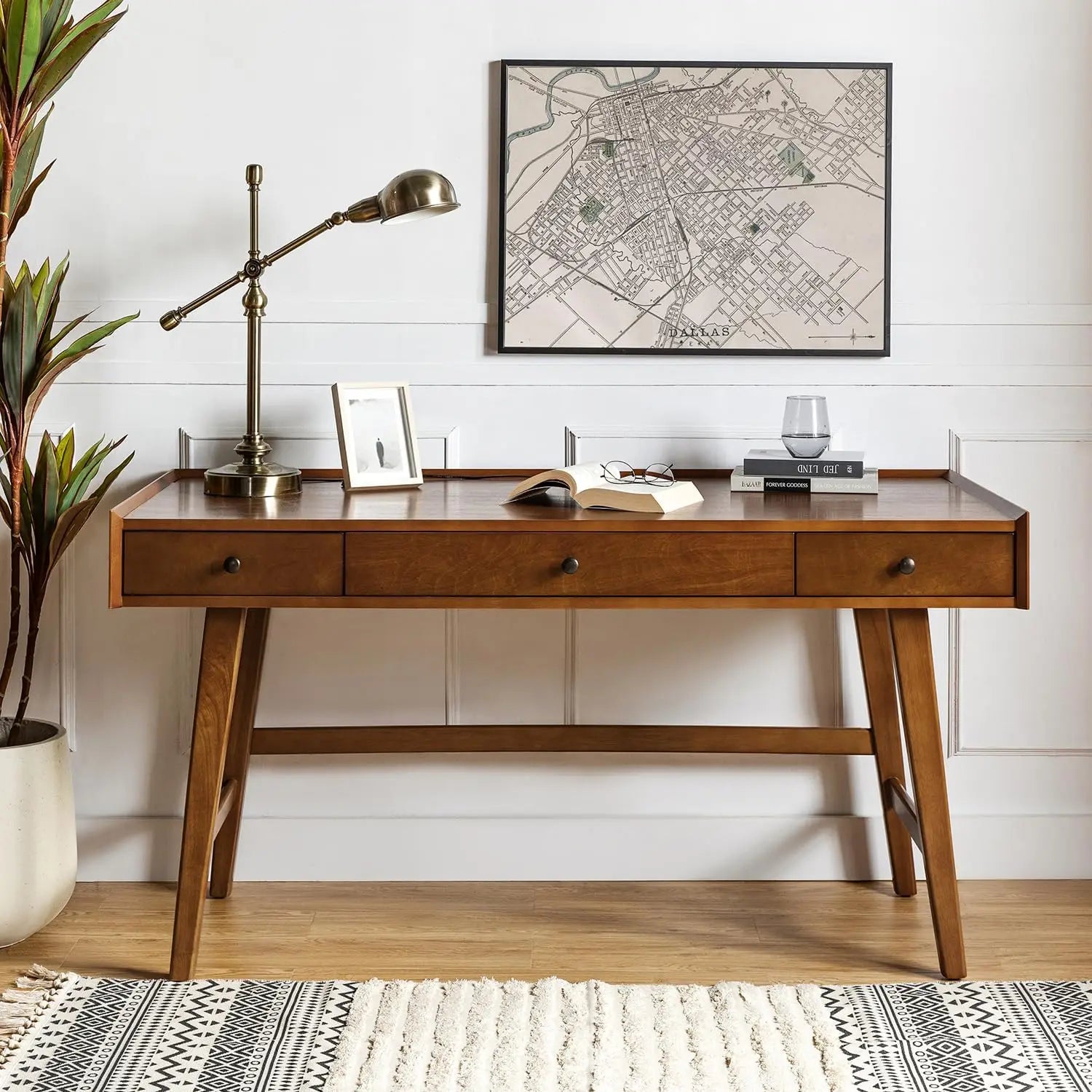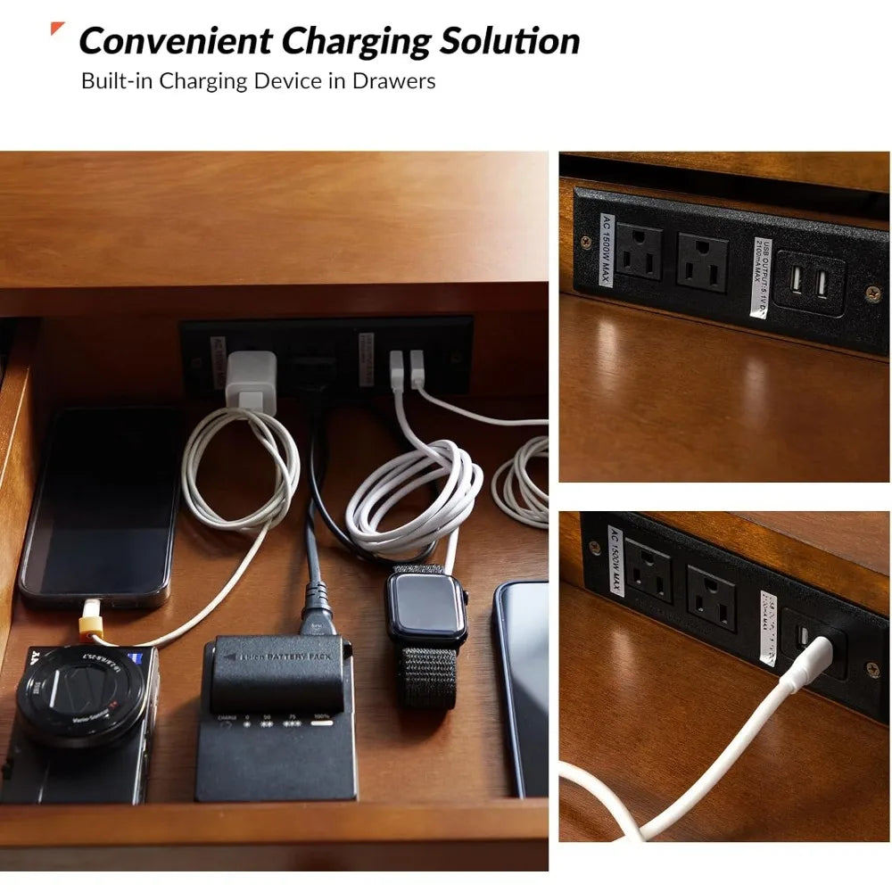 3-Drawer Office Desk Computer Desk with 3 Drawers, Solid Wood Legs, Charging Station, Cable Management, Mid Century Modern Writing Desk