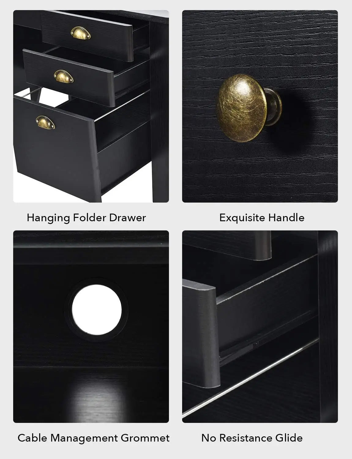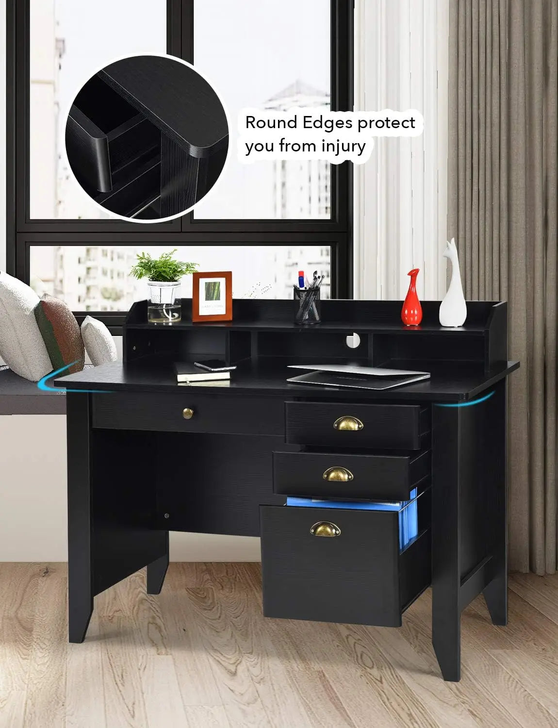 Desk with Drawers and Hutch, Vintage, Wood Home Office Desk, Writing, Study, PC Laptop Table, desktop: 47.5" x 22", Feature a file drawer , letter-size hanging files on the bottom, two shallow drawers on the right, and a center drawer.