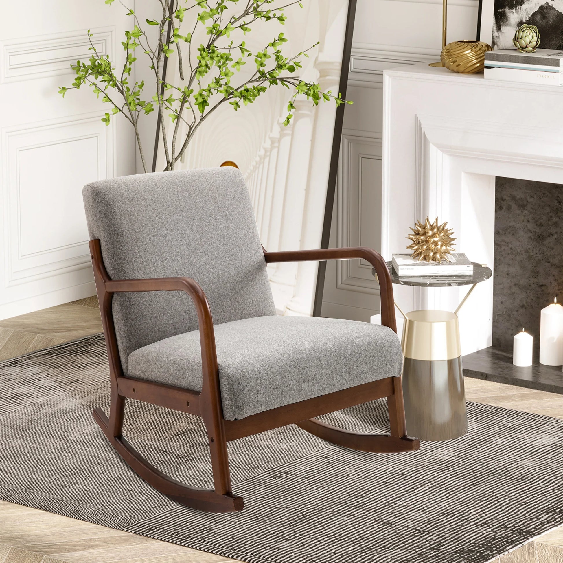 Wooden Framed Light Grey Linen Rocking Chair