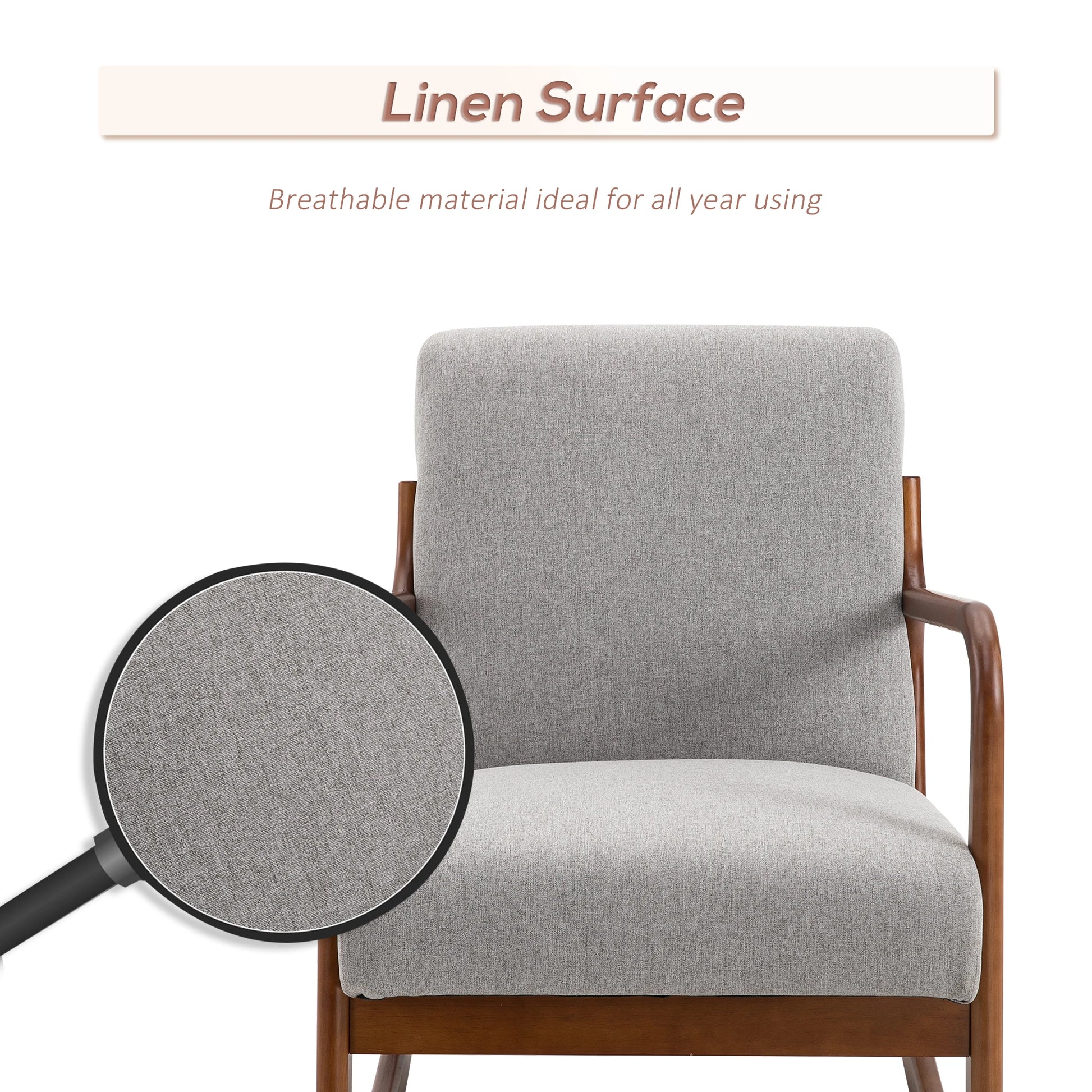 Wooden Framed Light Grey Linen Rocking Chair, Living Room, Bedroom, Office, Side Chair, Thick Padded Cushions, Back Support